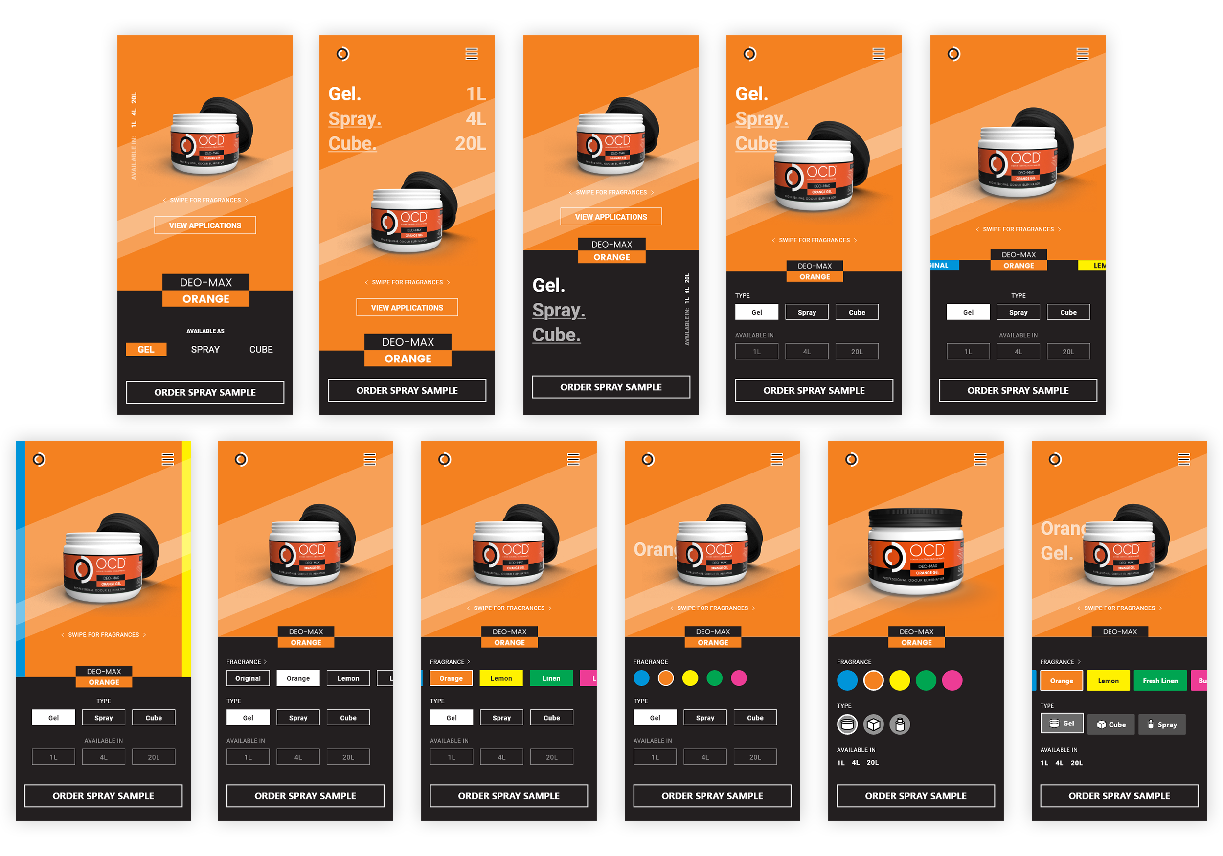Rather than navigate through all 24 different combinations using cards, I suggested using a single product page, with fragrance and type selectors allowing users to mix and match to create all of the different variations.