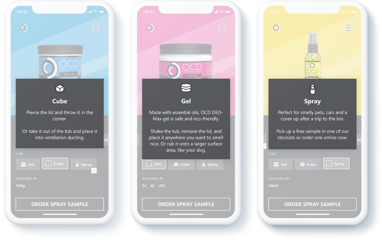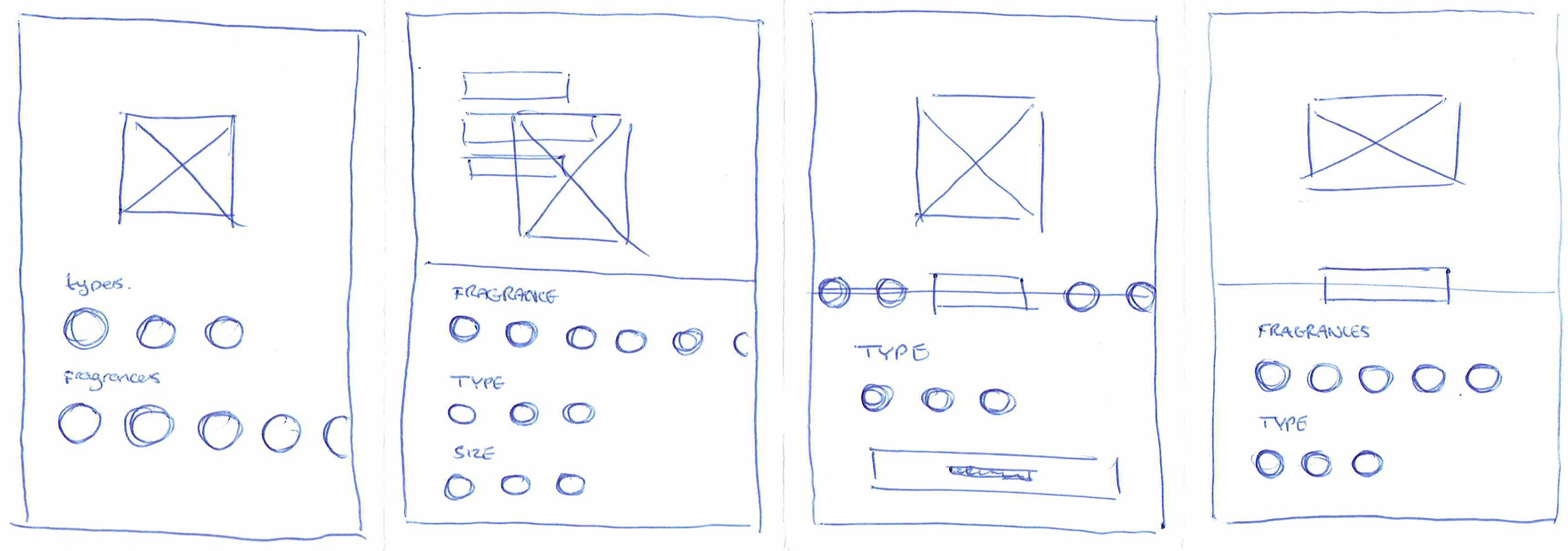 Two rows of selectors - split into 'fragrance' and 'type' - allowed users to quickly navigate through all possible combinations. Icons were included on the type selectors to help differentiate the options and aid users' understanding of the different types.
